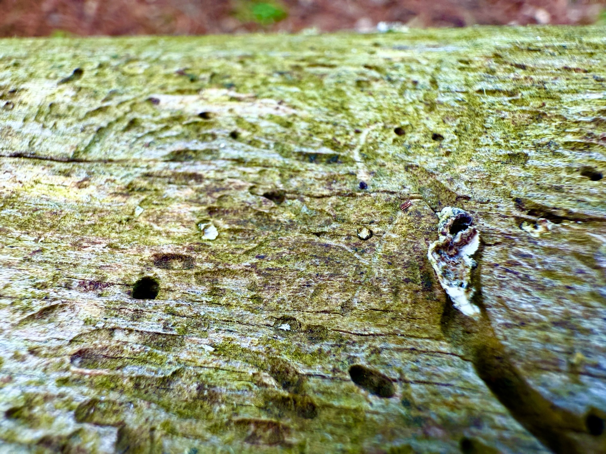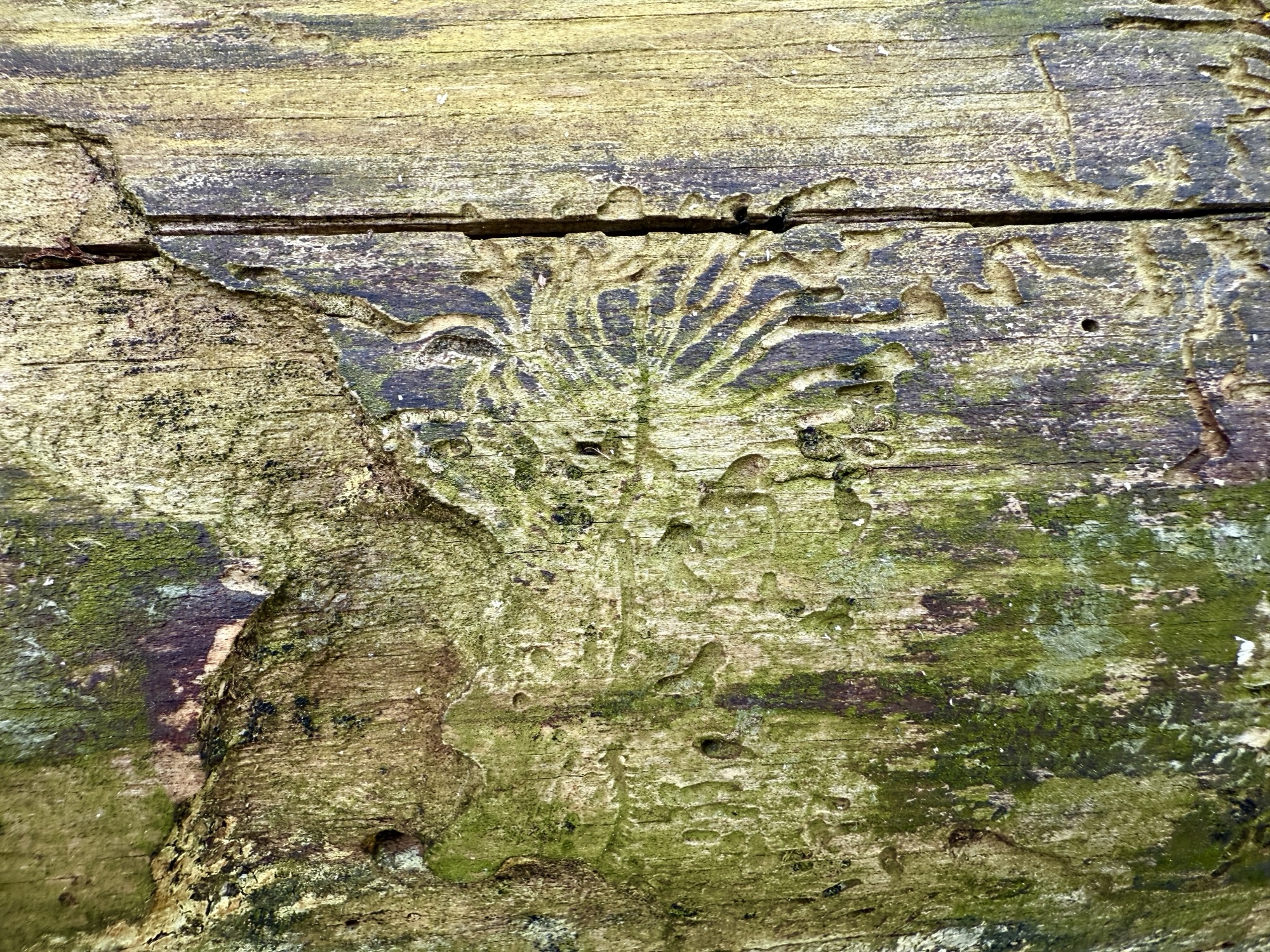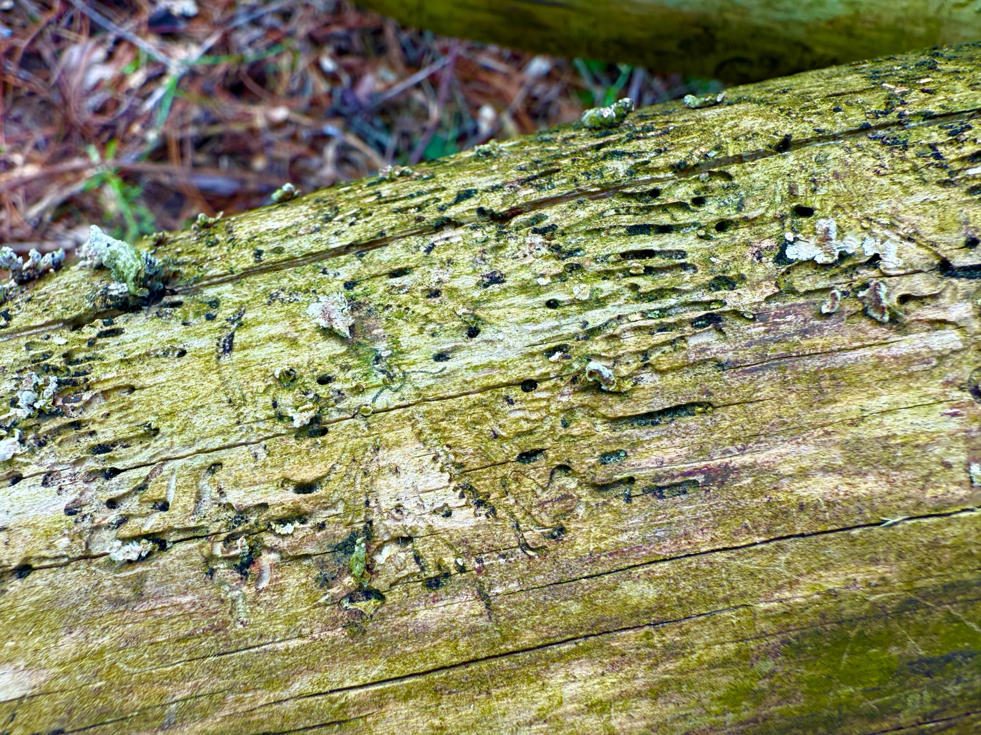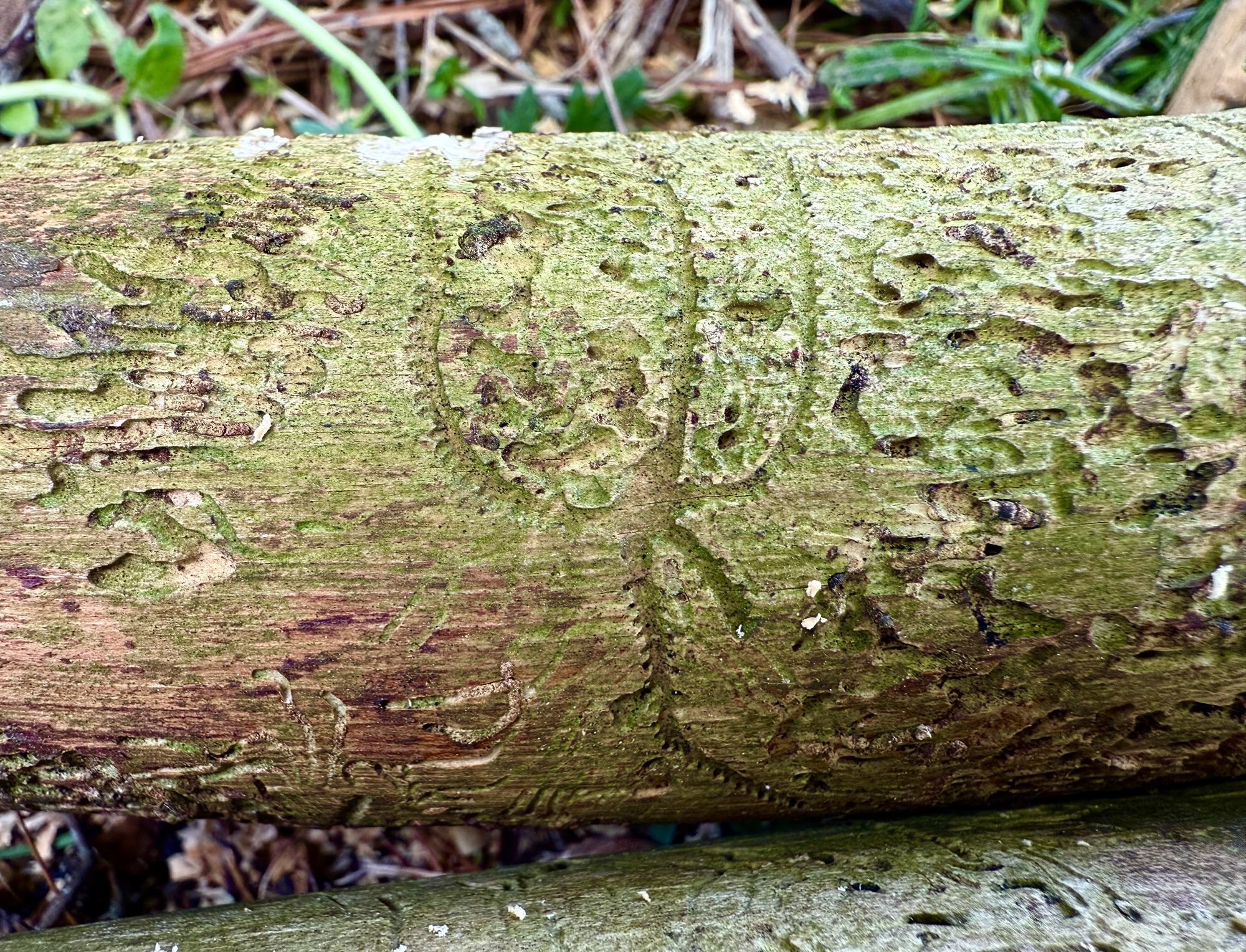 We were cutting down a dead pine today and I noticed these really cool patterns on the trunk. I don’t know what made them. I’d guess some combination of bugs and birds. Regardless of the artists’ species I enjoy their work.